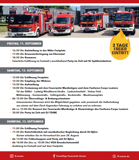 130 Jahre Feuerwehr Arnum dreitägige Feier zum 130-jährigen Bestehen der Ortsfeuerwehr Arnum Programm 130 Jahre FF Arnum Murowana-Goslina-Park, Arnumer Kirchstraße 1A, 30966 Hemmingen Wir freuen uns auf euren Besuch und drei wundervolle gemeinsame Tage!