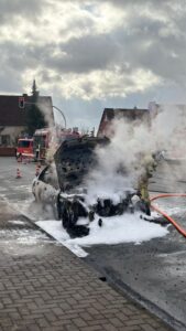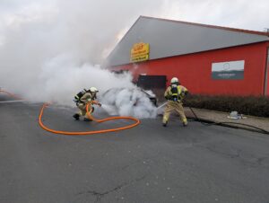 Vor Ort bestätigte sich die Lage: Ein Fahrzeug stand in Flammen. Umgehend ging ein Trupp unter schwerem Atemschutz zur Brandbekämpfung vor. Zunächst wurde das Feuer mit Wasser eingedämmt, bevor im weiteren Verlauf Löschschaum eingesetzt wurde, um auch tieferliegende Brandnester sicher zu ersticken. Im Zuge der Sicherungsmaßnahmen wurde zudem die Fahrzeugbatterie abgeklemmt, um weitere Gefahrenquellen auszuschließen.